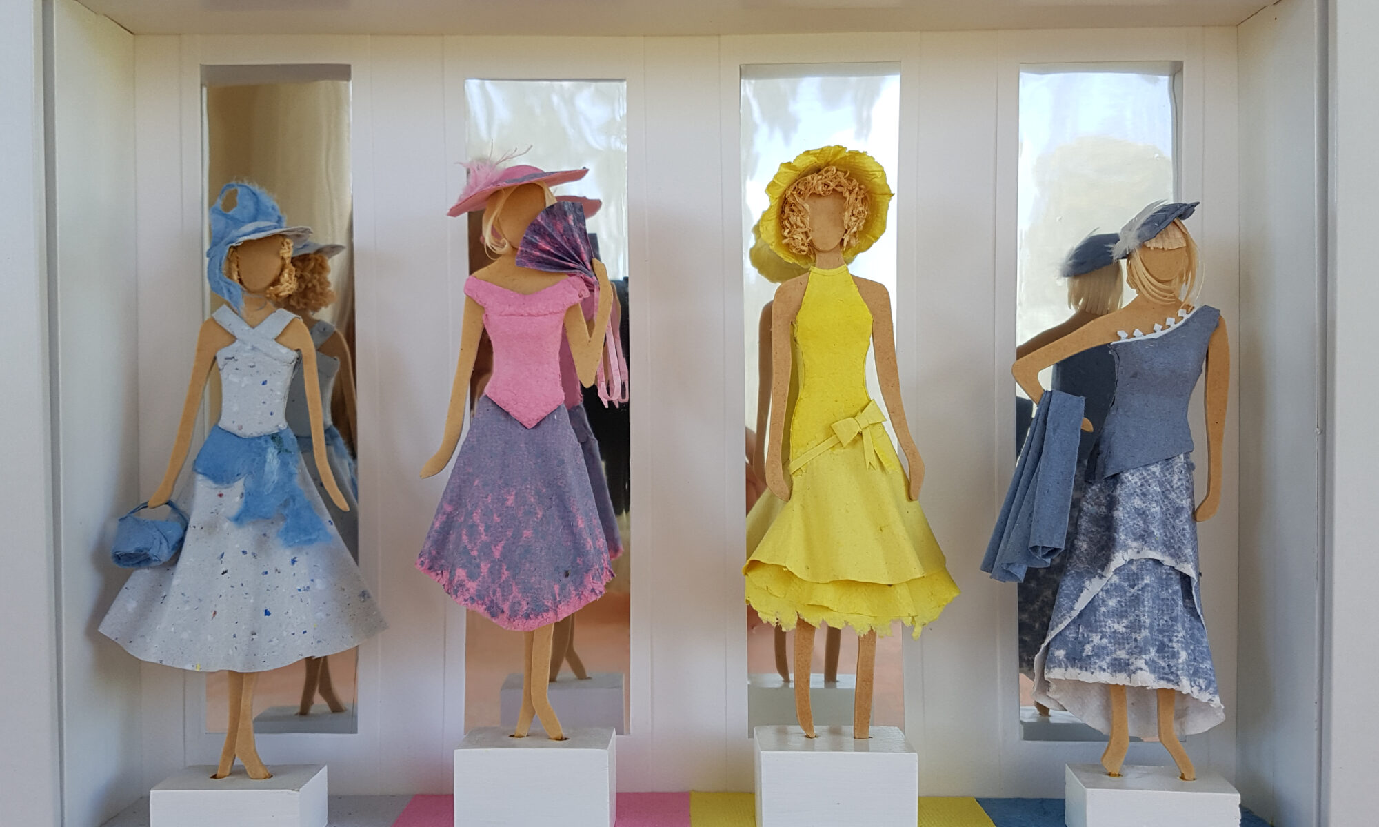 - At the front, two layers of people are adhered to clear acrylic strips and placed over mirror paper so their reflections simulate walking on a wet path.