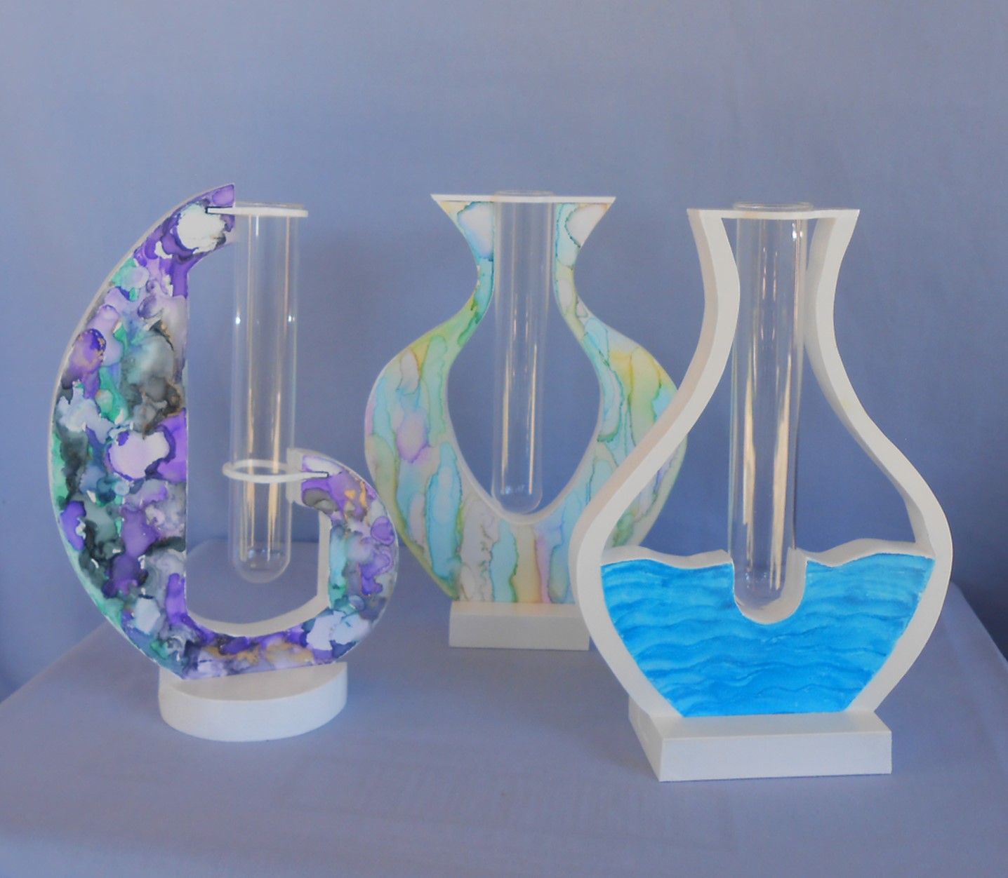 The designs are cut with a scroll saw and the cut edges painted. I was curious to see if alcohol inks would take on the laminated surfaces. I experimented with various techniques to obtain the different finishing effects.